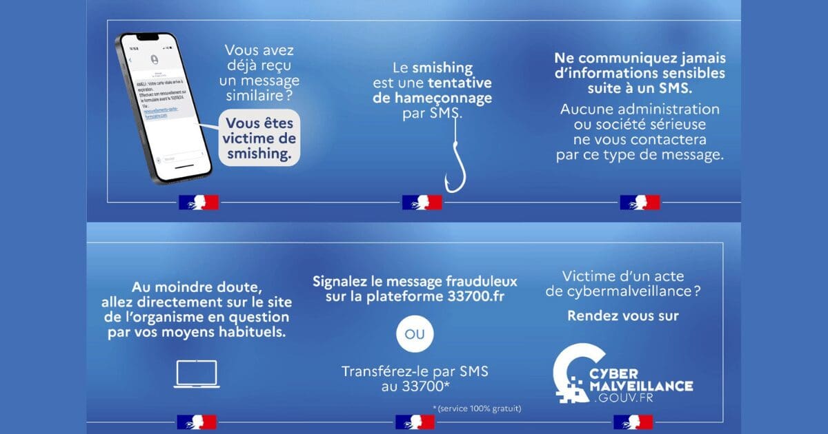 Le #smishing est une forme de hameçonnage par SMS où le cybercriminel usurpe l’identité d’un tiers.