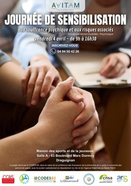 Le vendredi 4 avril de 9h à 16h30, le CODES83 organise une journée dédiée à la compréhension et à la prévention de la souffrance psychique et des risques associés à laquelle le CLIC participera. Animée par un psychologue, cette journée sera rythmée par différentes activités et échanges pour mieux appréhender ces enjeux essentiels à la salle A de la Maison des Sports et de la Jeunesse.