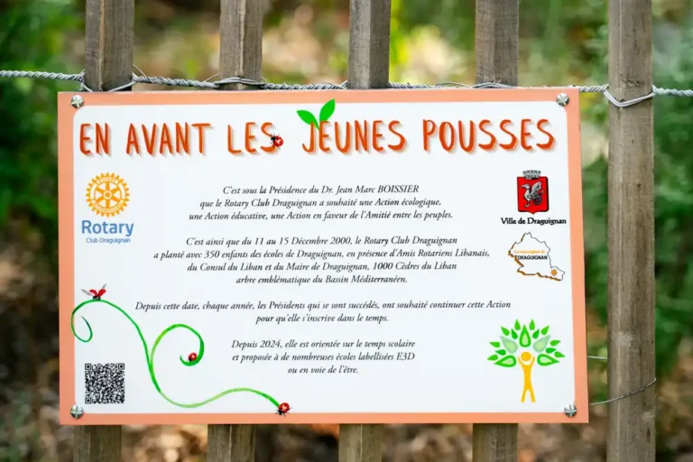 Pour marquer cette passation, un panneau Rotary club Draguignan, partenaire de l’opération, a été inauguré en présence de Grégory Loew, adjoint délégué à la Démocratie participative, Laure Kalis, présidente du Rotary club, Jean-Marc Boissier, membre du Rotary club et initiateur de l’opération de plantation au Malmont et des personnels du pôle Ville durable et numérique.