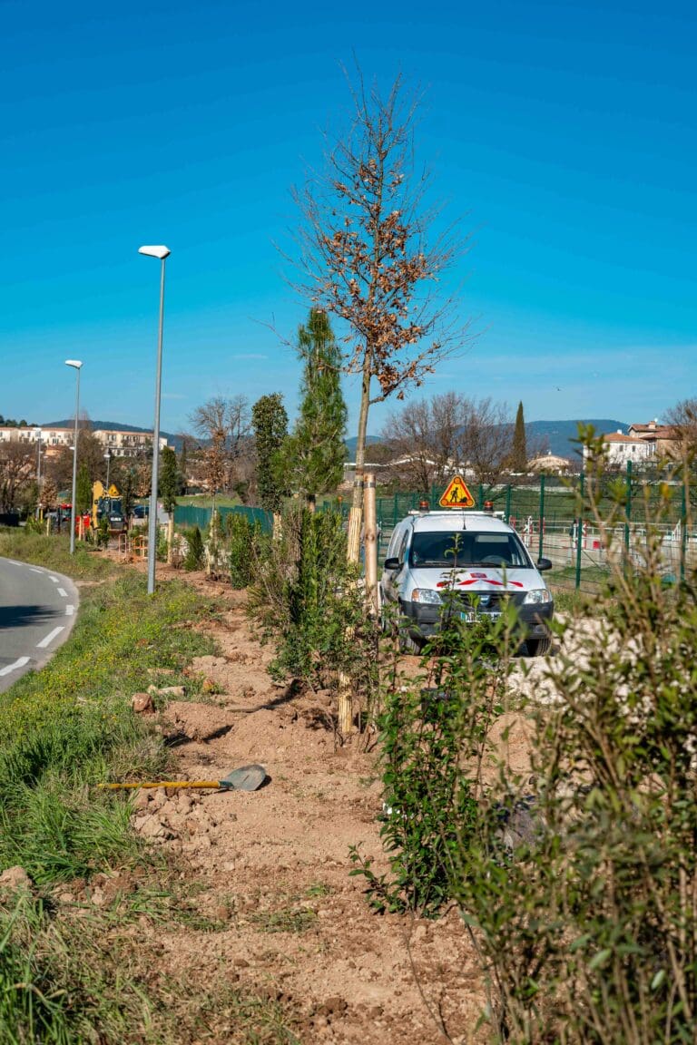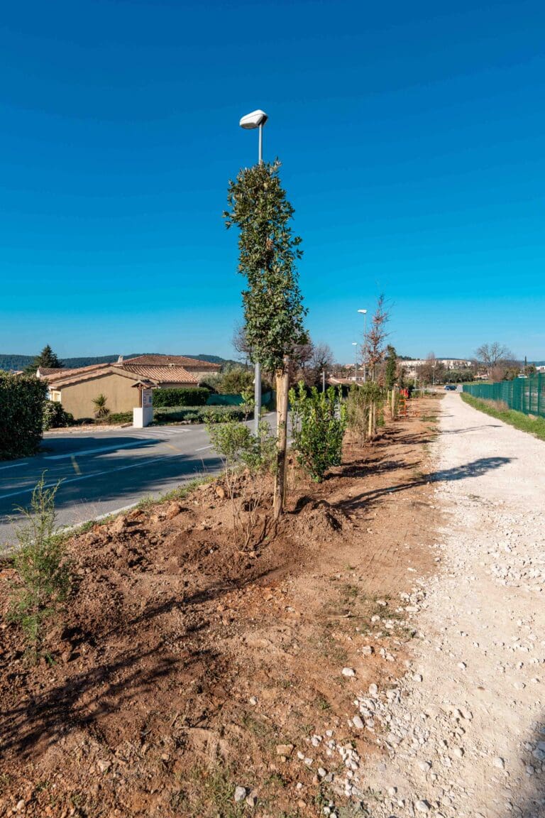 Une cinquantaine de végétaux sont actuellement en cours de plantation le long de ce chemin, qui sera agrémenté de bancs ultérieurement, dans le but de proposer une promenade ombragée et agréable en toutes saisons.