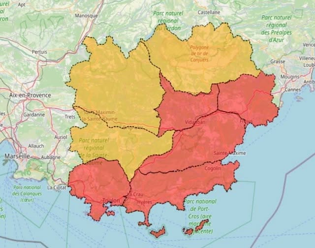 🔴 Risque incendie 🔥 TRÈS SÉVÈRE pour les Monts Toulonnais, les massifs du Centre-Var, de la Corniche des Maures, des Maures, de l’Estérel et des Îles d’Hyères :