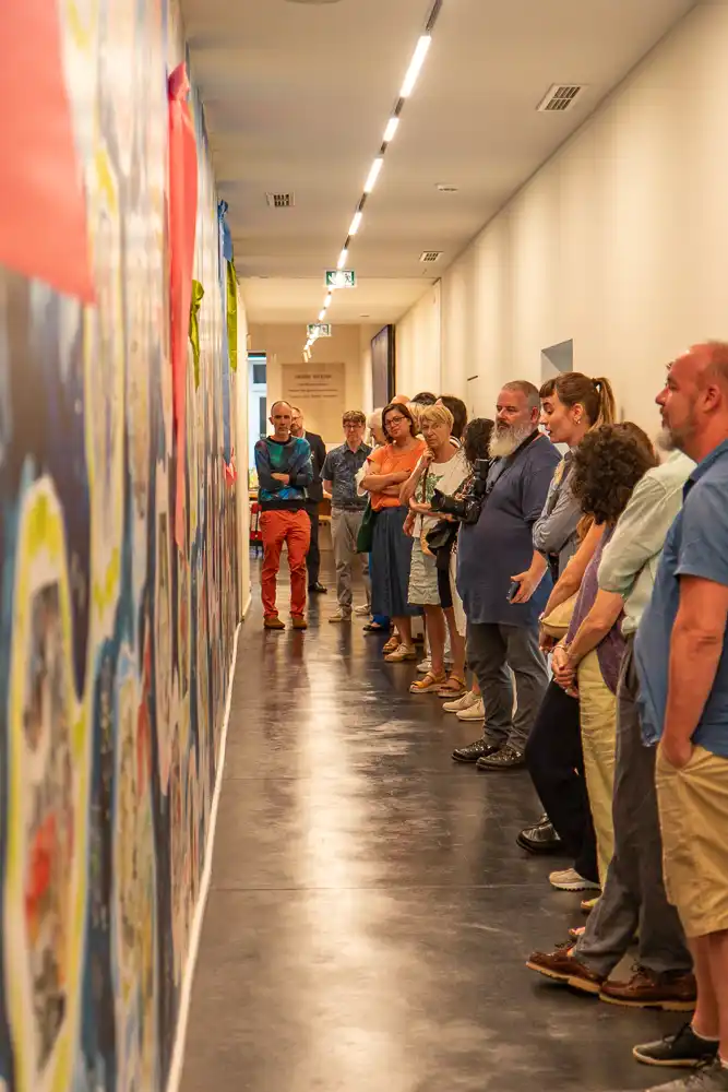 Expérimentant la répétition des motifs et sa propagation sur divers médiums, l’artiste a réalisé un papier peint reprenant le motif de la tomette, céramique fabriquée dans la région depuis le début du XIXe siècle et qui tapisse le sol des salles d’exposition du musée.
