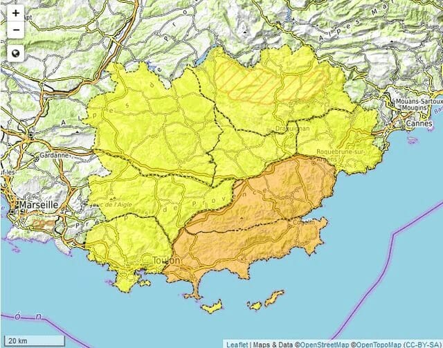 🟠les 2 massifs de la Corniche des Maures et des Maures sont en risque 🔥SÉVÈRE : accès déconseillé