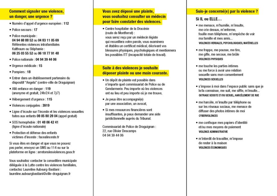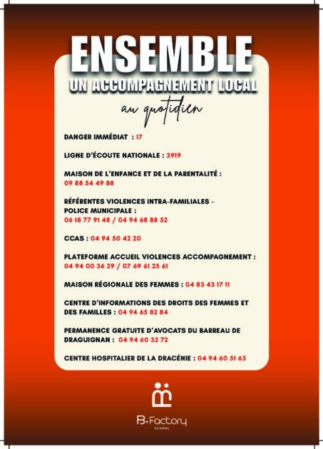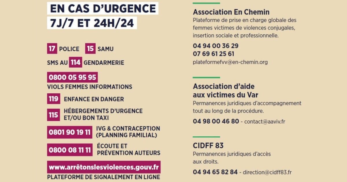 Permanence des avocats qui œuvrent pour la défense des victimes de violences conjugales : 04 94 60 32 72.