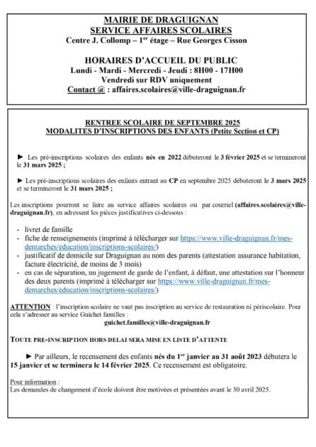 Mais si vous résidez à Draguignan et que votre enfant est né entre le 1er janvier 2023 et le 31 août 2023, son recensement est obligatoire et devra être fait auprès du Service Affaires Scolaires impérativement avant le 15 février 2025.