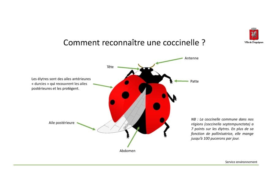 Il existe une centaine d’espèces de coccinelles en France (6 000 dans le monde). La plus connue est la coccinelle à 7 points.
