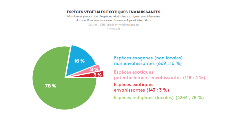 En France, on compte environ 5300 espèces indigènes et 700 espèces exotiques naturalisées. Parmi les 700 espèces naturalisées, un peu plus d’une centaine d’espèces sont considérées comme invasives. Dans le Var nous pouvons retrouver l’Ambroisie, l’Ailantes mais aussi le Mimosa d’hiver.
