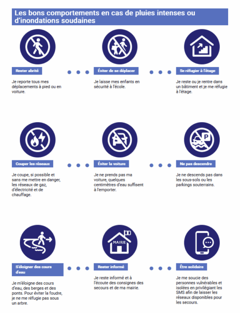 Le Document d’information communal sur les risques majeurs (DICRIM) a été remis à jour en 2022. Inondations, canicule, feux de forêts, vents violents, mouvements de terrain, alerte attentats… chaque risque majeur existant sur la commune est décliné en une fiche didactique retraçant les consignes à respecter et les bons réflexes à adopter pour assurer la sécurité de tous.