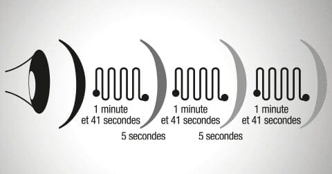 Testé chaque premier mercredi du mois à midi, ce signal est émis par un son continu diffusé en 3 cycles successifs d’1 minute et 41 secondes, séparés d’un intervalle de 5 secondes :